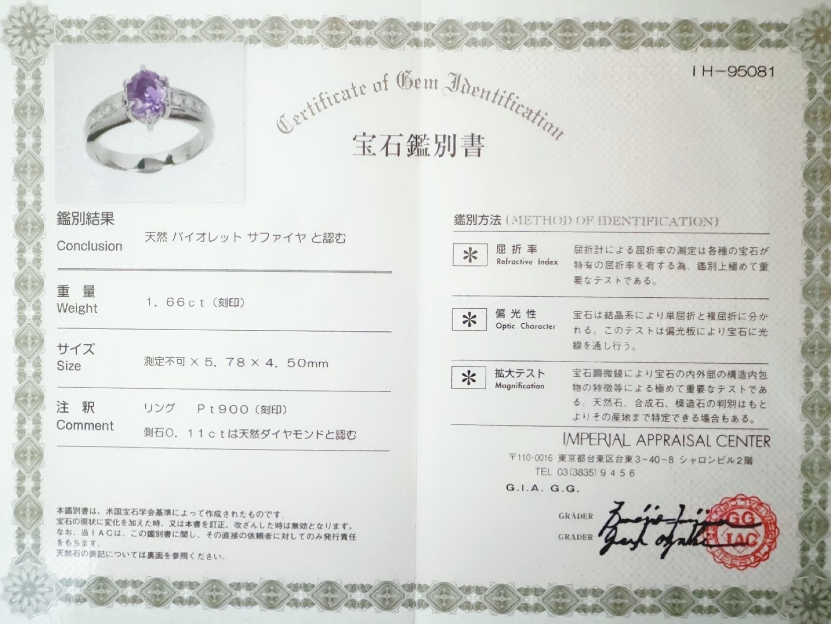 こちらのリングには、IMPERIAL APPRAISAL CENTER(IAC)発行の宝石鑑別書が付属しており、品質の確かなお品であることが保証されています。バイオレットサファイアの天然石証明に加え、脇石のダイヤモンドも天然であることが確認されています。