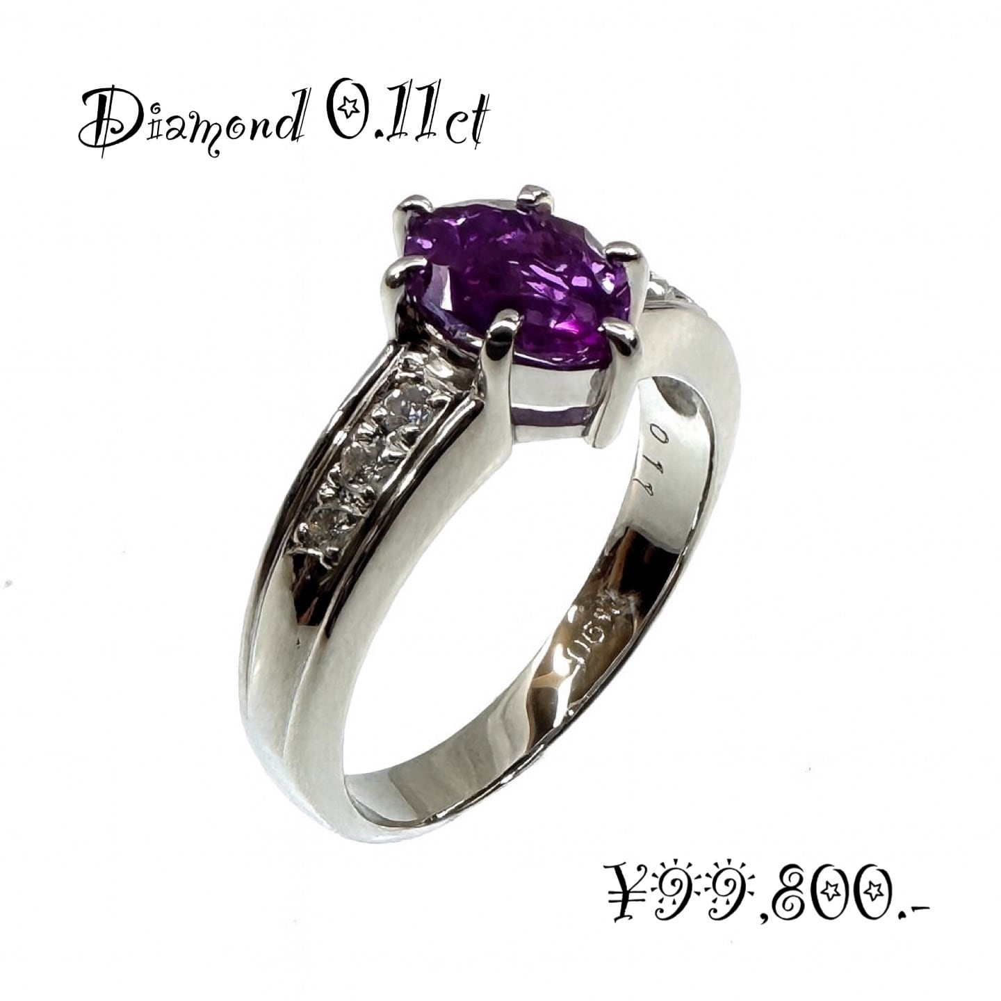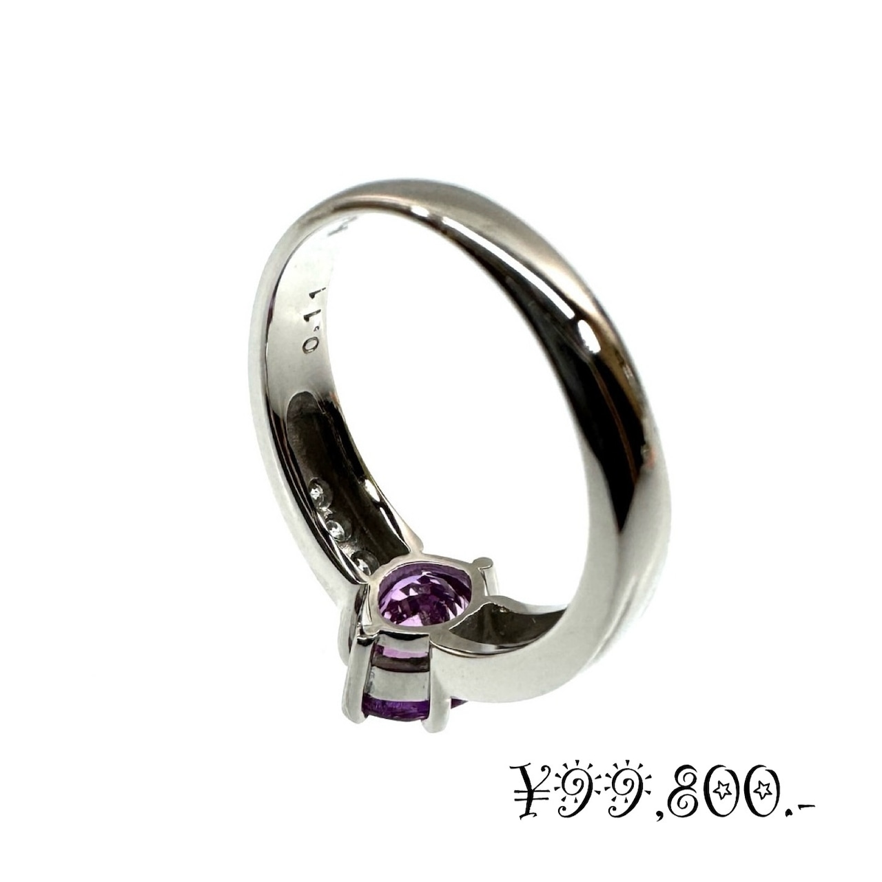 センターには、存在感のある1.66カラットの天然バイオレットサファイアをセッティング。透明度が高く、光の角度によって多彩な輝きを見せる上質な一石です。脇には合計0.11カラットの天然ダイヤモンドを配し、華やかさと上品さを兼ね備えたデザインに仕上がっています。輝きのコントラストが美しく、中央のサファイアをより印象的に引き立てます。