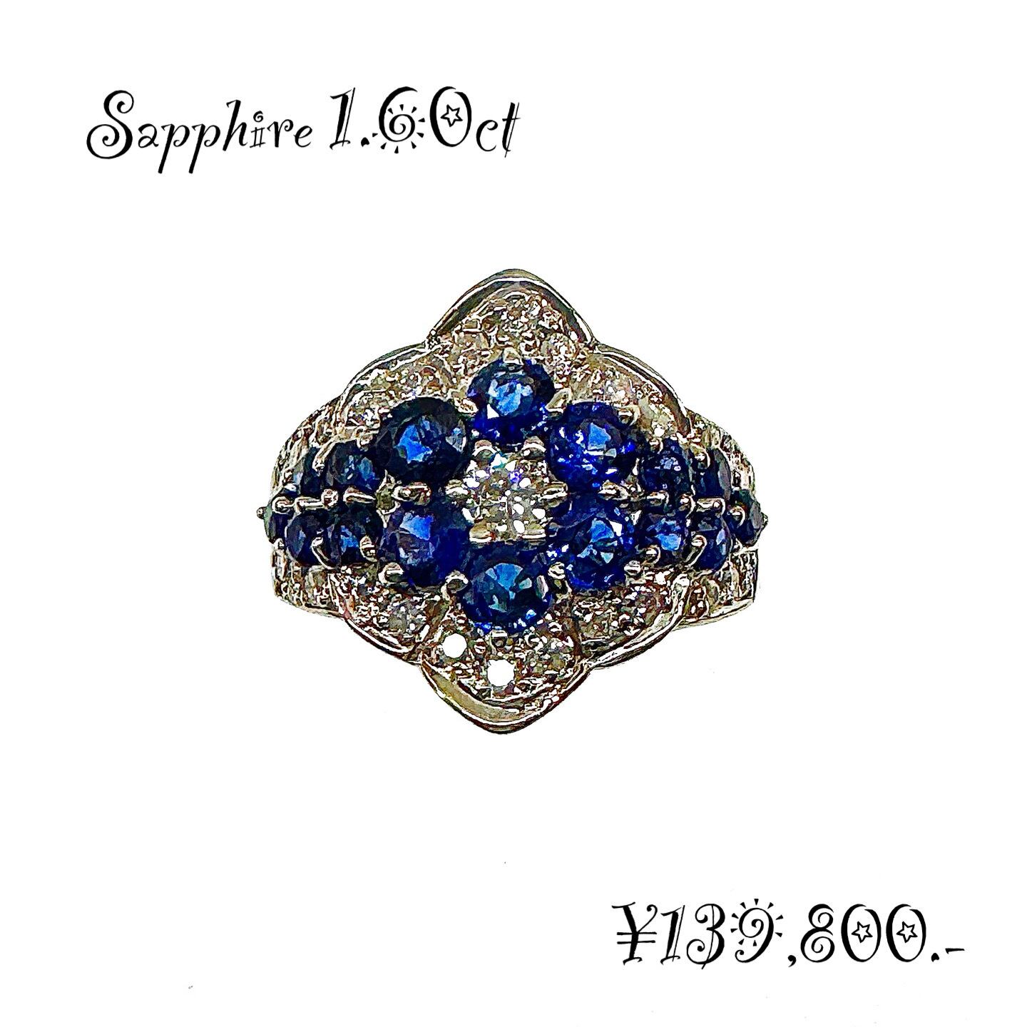 使用されているサファイアは総計1.60カラット。ラウンドカットの石を丁寧にセッティングし、中央に向かって光が流れるような構成が特徴です。