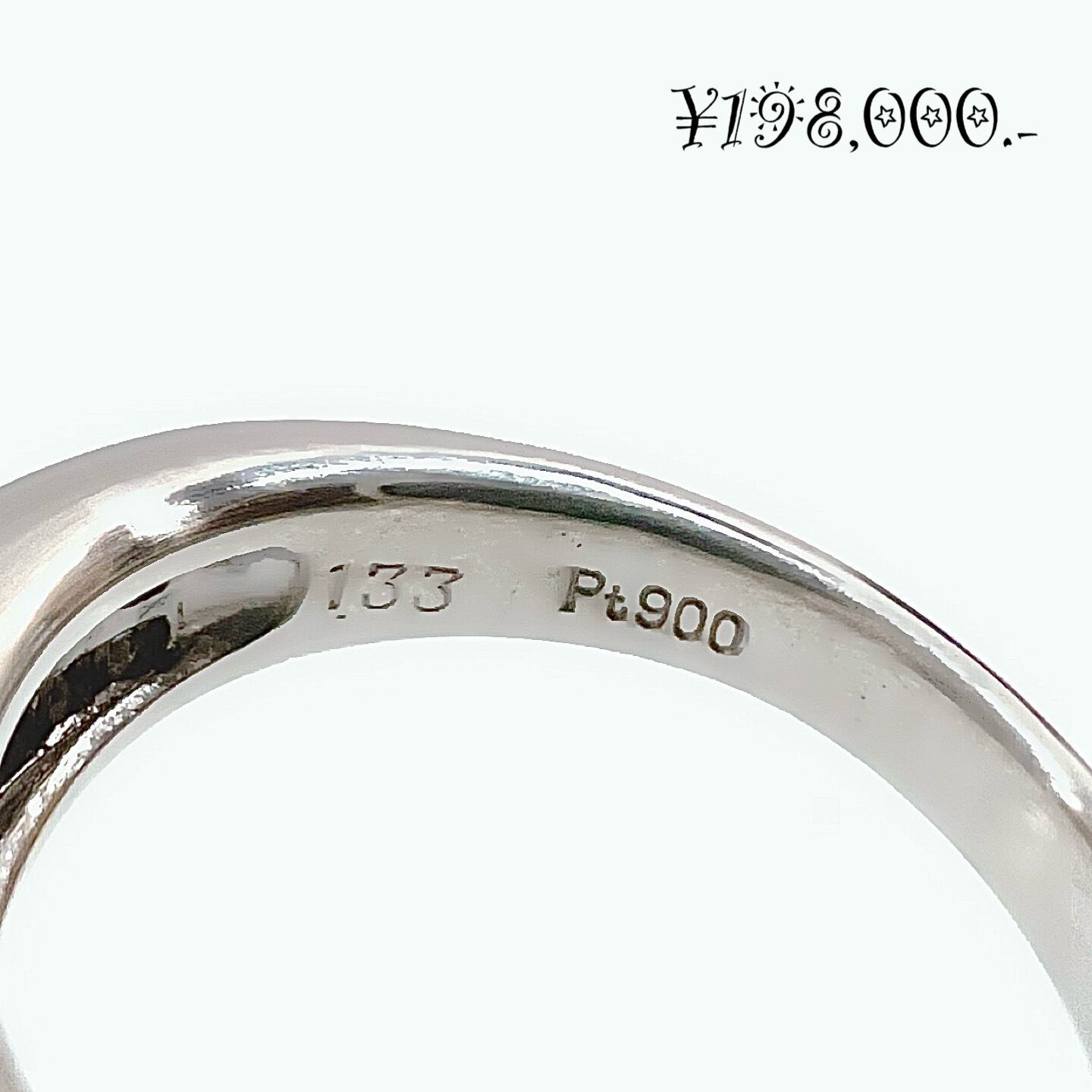 リング部分はPt900を使用。プラチナは変色や変質に強く、日常的に身につけても長く美しさを保てる貴金属です。しっかりとした厚みと重量感があり、指通りもなめらかで安定感があります。重量は約9.0gとずっしりとした安心感があり、重厚なプラチナの質感をしっかりと感じられます。