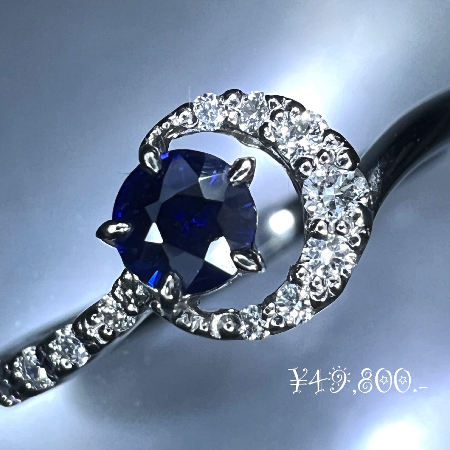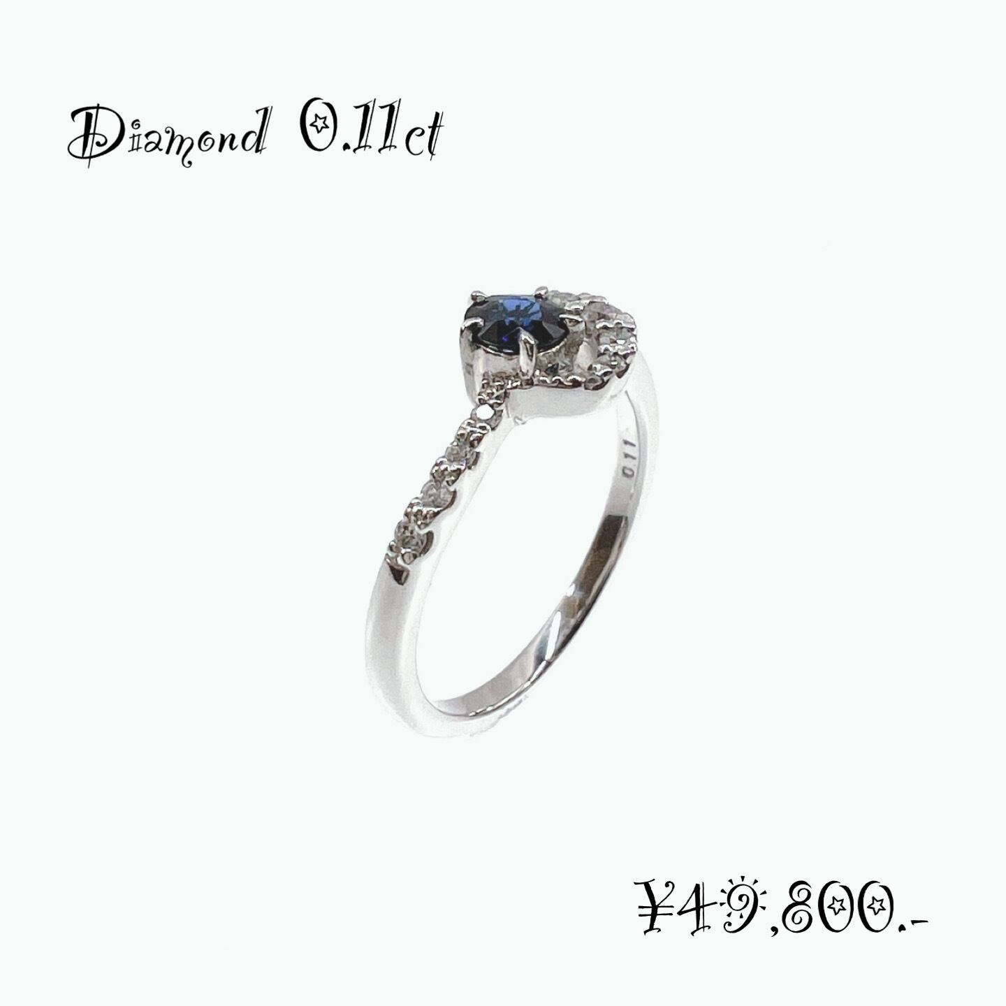 中央には、夜空を思わせる濃紺の天然サファイアが一石セッティングされ、見る角度によって透明感のある青い光を放ちます。