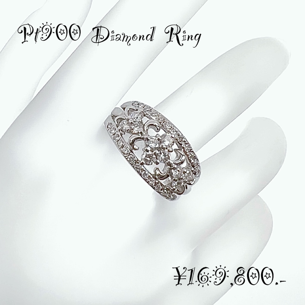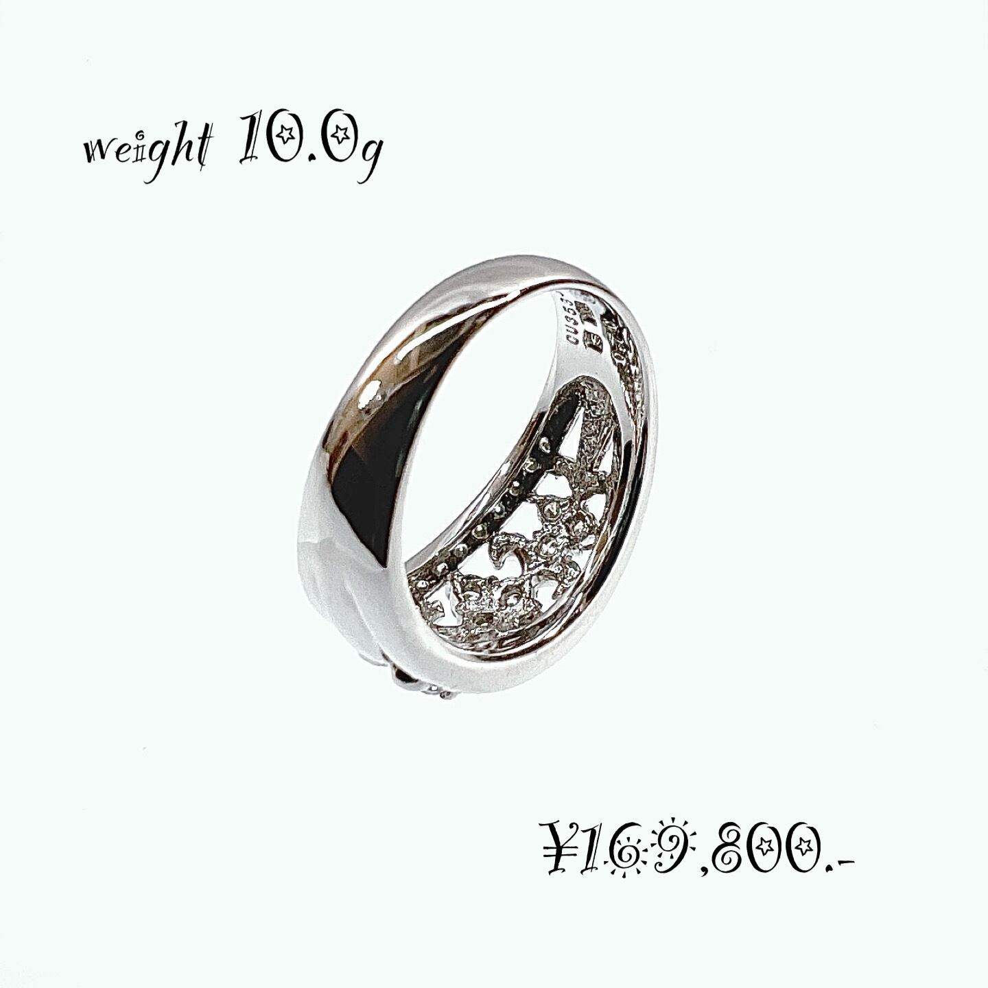 サイズは14.5号。幅広のフォルムながらも透かしデザインにより軽やかな印象で、女性らしい優雅さと存在感を兼ね備えています。結婚記念日や特別なギフト、自分へのご褒美ジュエリーとしてもおすすめの逸品です。