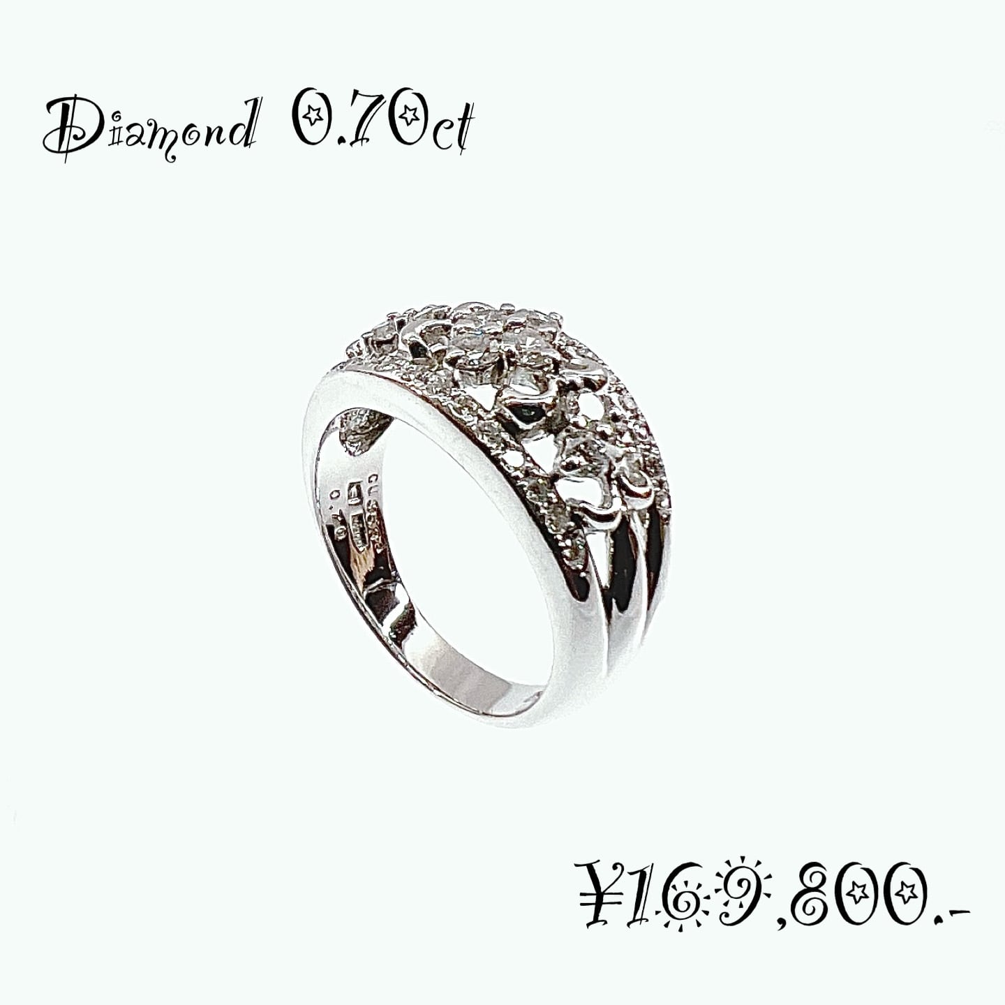ダイヤモンドの総カラット数は0.70ct。しっかりとした存在感がありながらも、繊細な透かし模様が軽やかな印象を与え、フォーマルにもデイリーにも映えるデザインです。リング全体の曲線が美しく、指なじみの良い滑らかな仕上がりも魅力のひとつです。