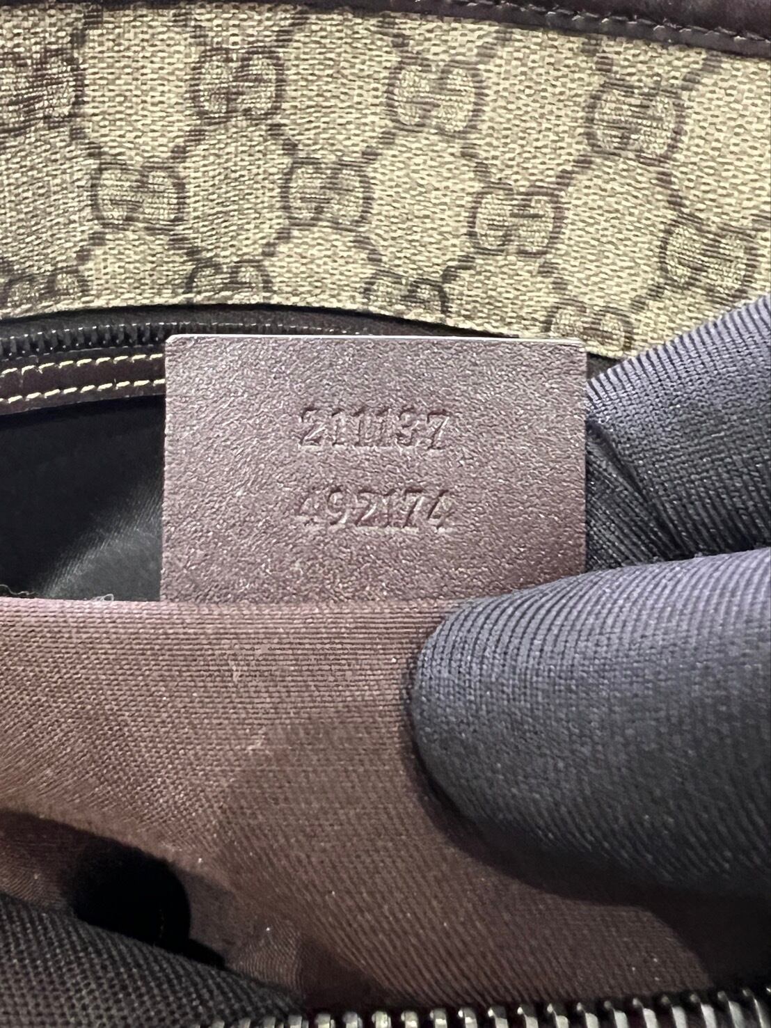 内側レザーパッチには「GUCCI made in italy」の刻印、背面にはシリアルナンバー「211137・492174」が確認できる正規品。流行に左右されないシンプルなデザインと、確かなブランドクオリティが魅力のバッグです。