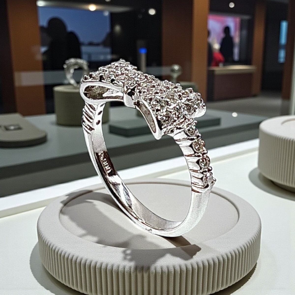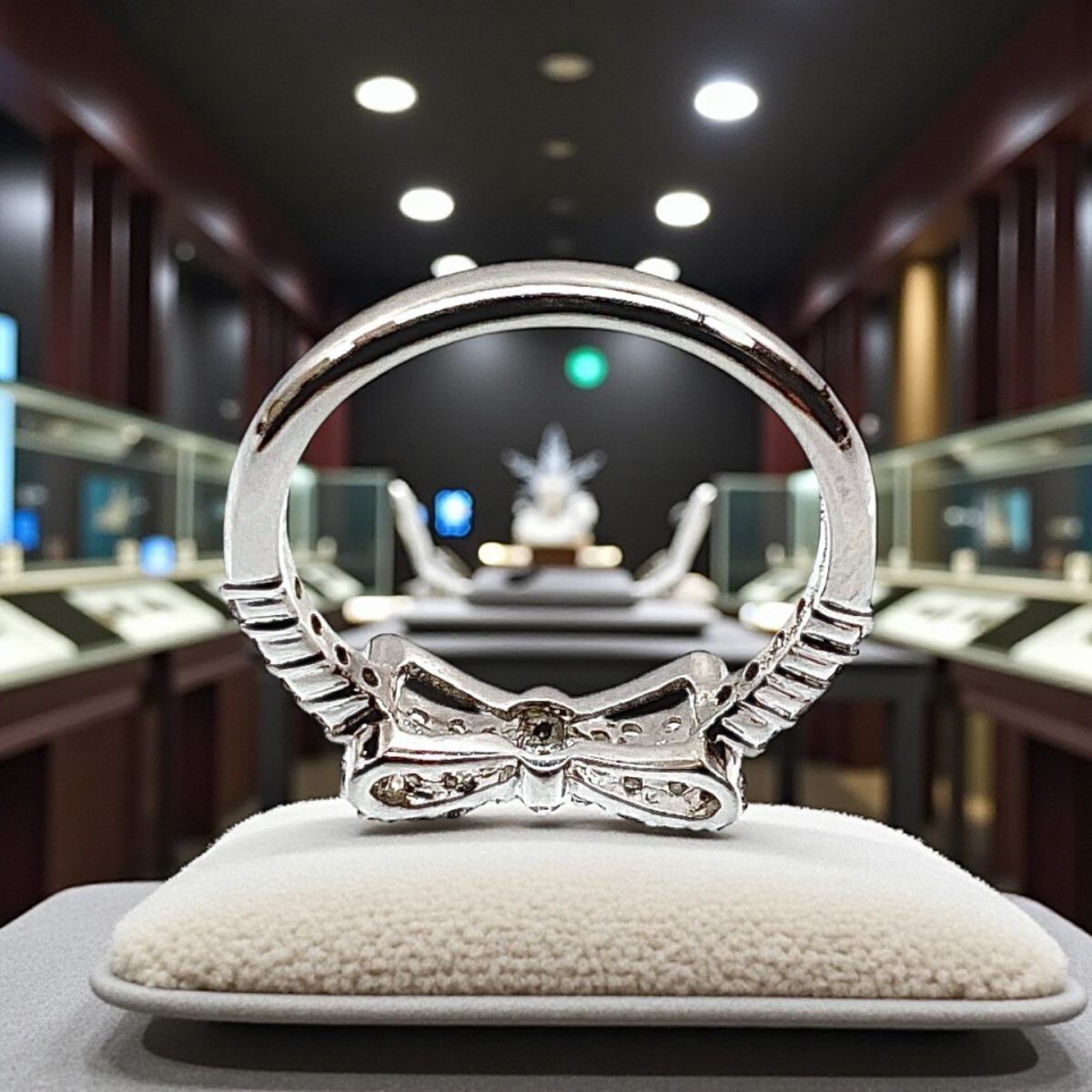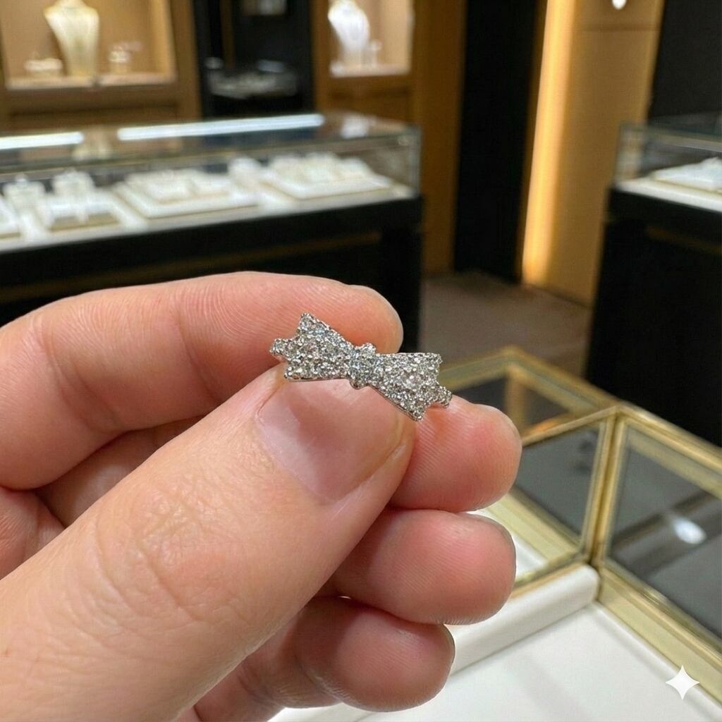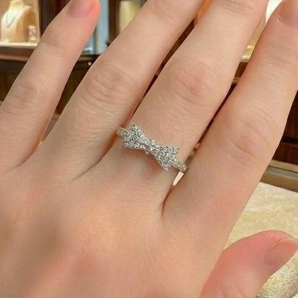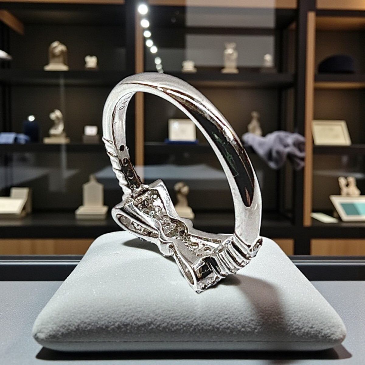 中央部分からサイドにかけて丁寧に並べられたメレダイヤが、角度を変えるたびに繊細な輝きを放ち、リボンのフォルムをより立体的に引き立てています。