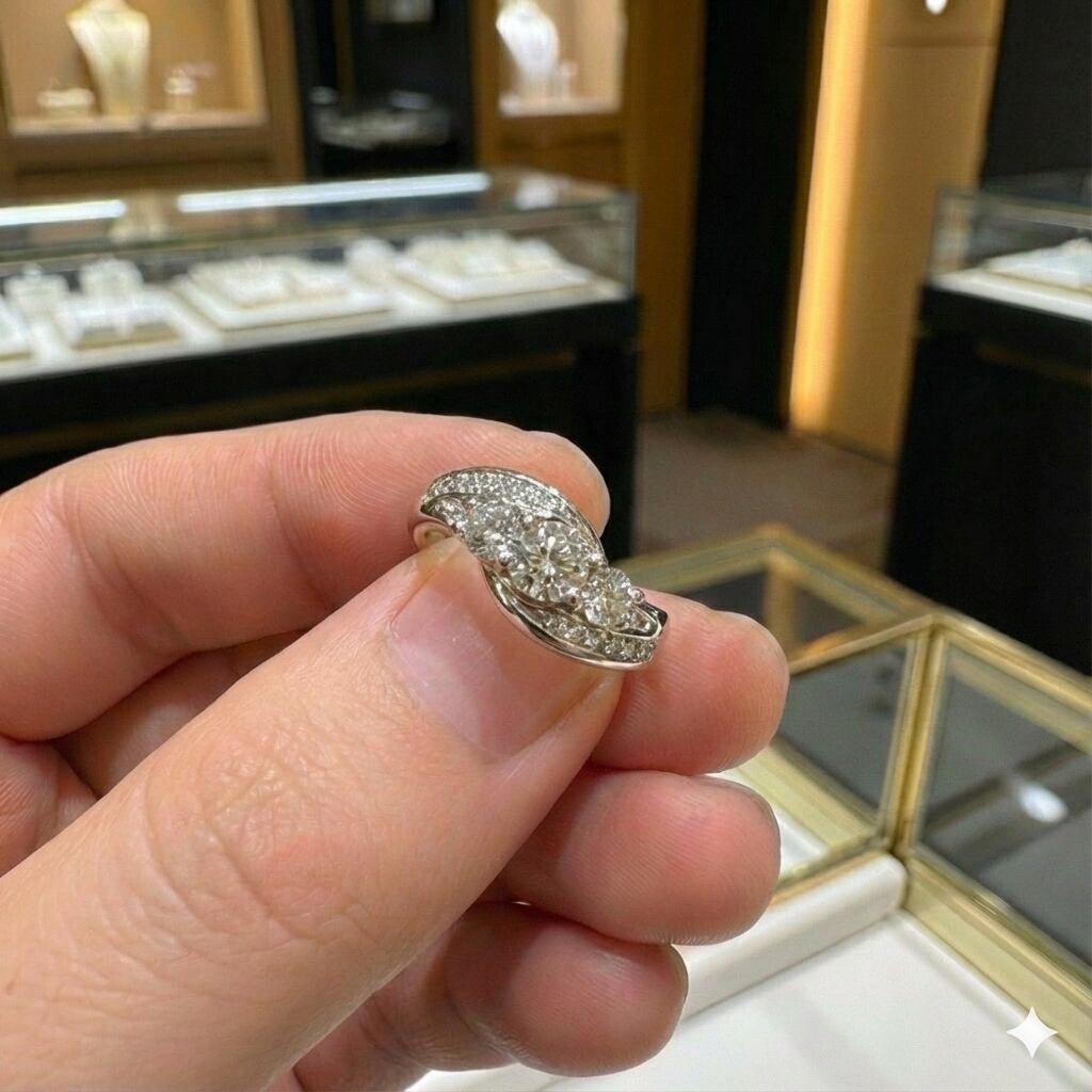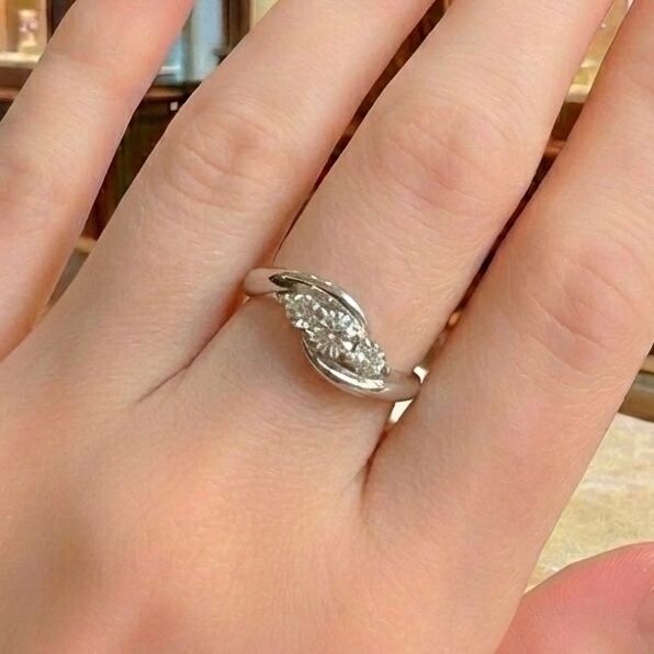 サイズは8号で、指先に自然に馴染むバランスの取れたシルエット。流れるようなデザインが手元を美しく見せ、エンゲージリングや記念日の贈り物としても最適です。