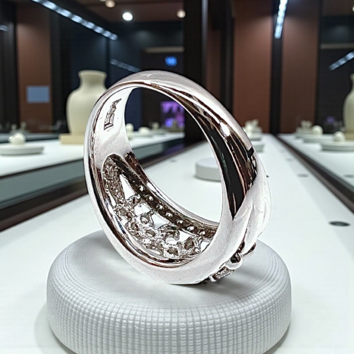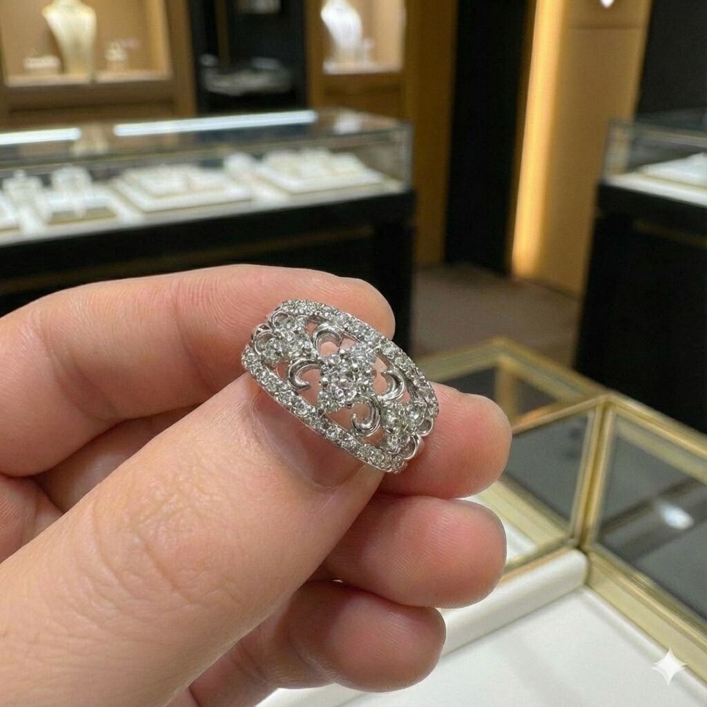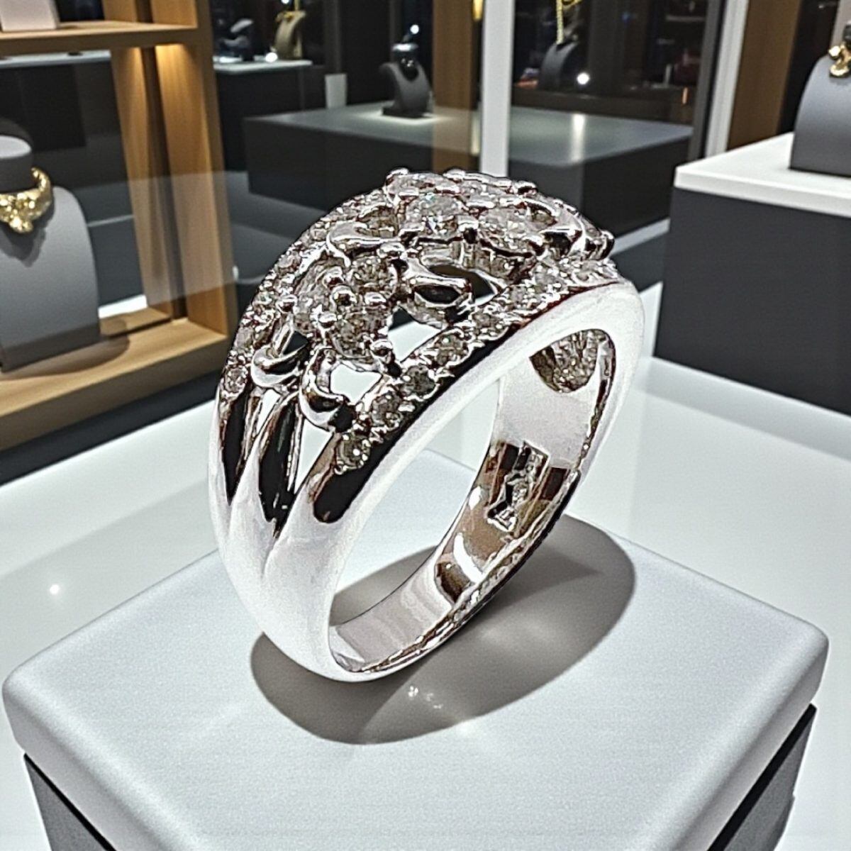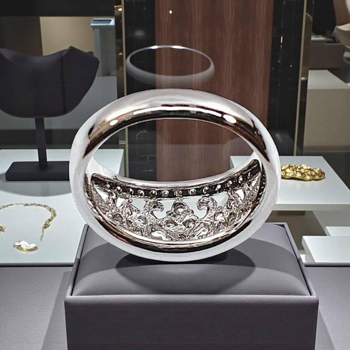 サイズは14.5号。幅広のフォルムながらも透かしデザインにより軽やかな印象で、女性らしい優雅さと存在感を兼ね備えています。結婚記念日や特別なギフト、自分へのご褒美ジュエリーとしてもおすすめの逸品です。