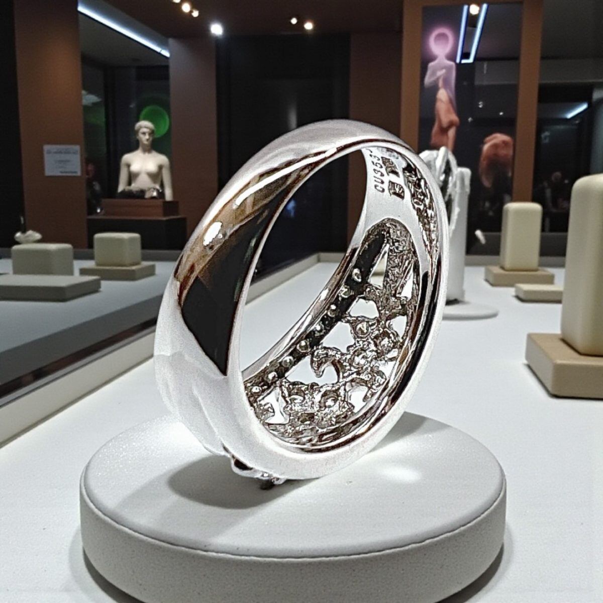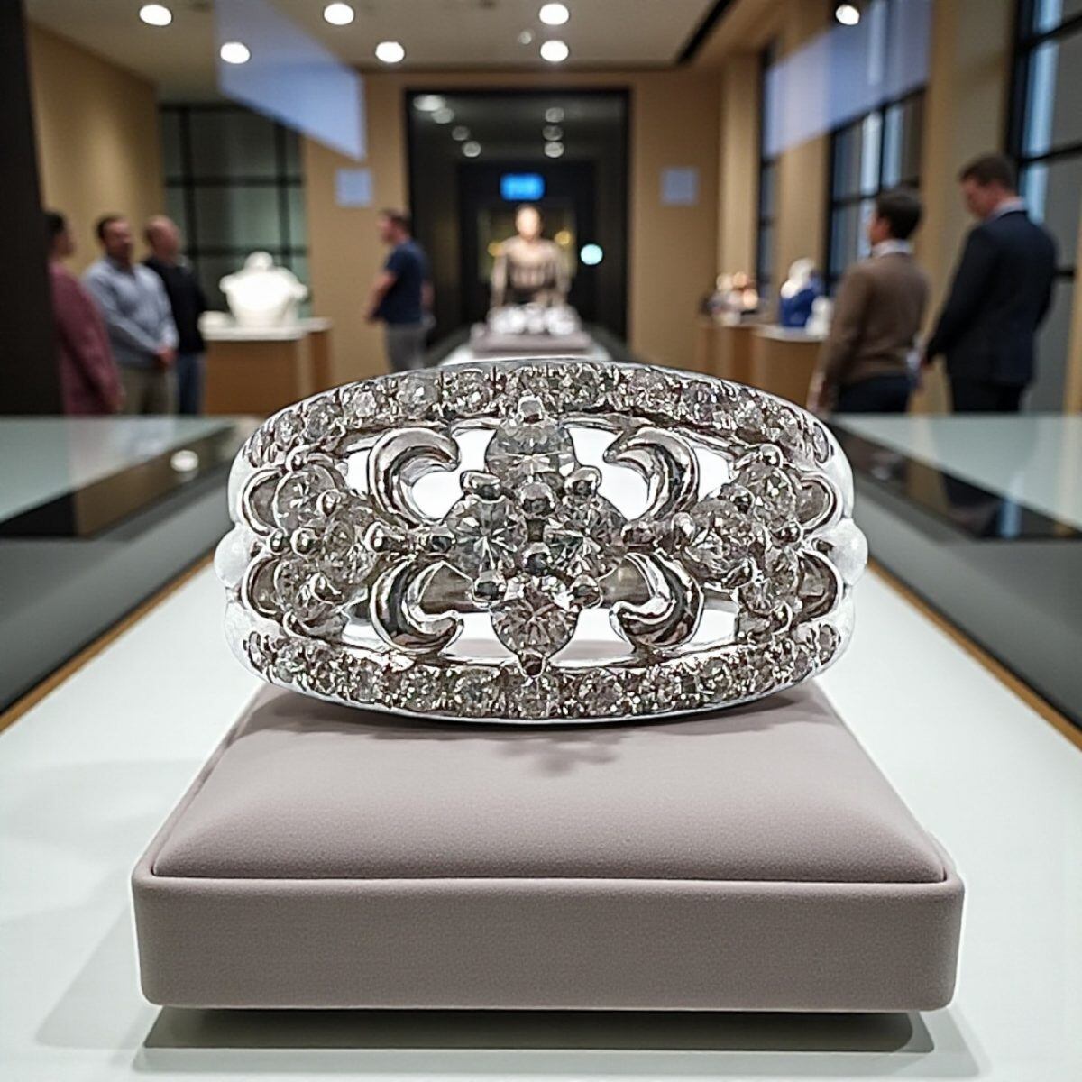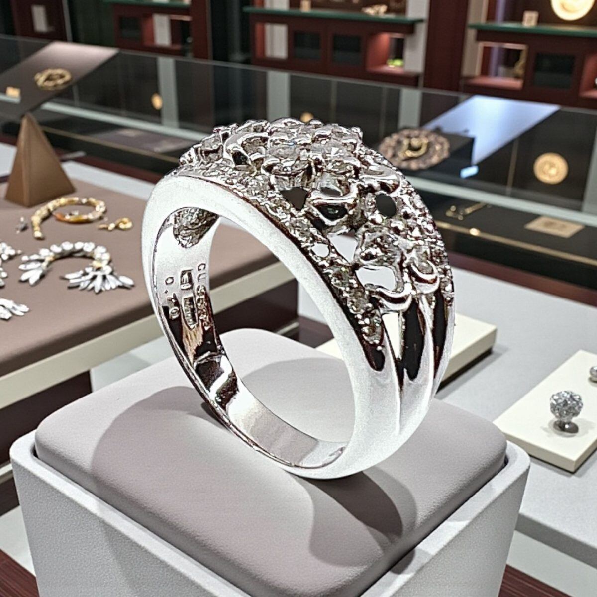サイズは14.5号。幅広のフォルムながらも透かしデザインにより軽やかな印象で、女性らしい優雅さと存在感を兼ね備えています。結婚記念日や特別なギフト、自分へのご褒美ジュエリーとしてもおすすめの逸品です。